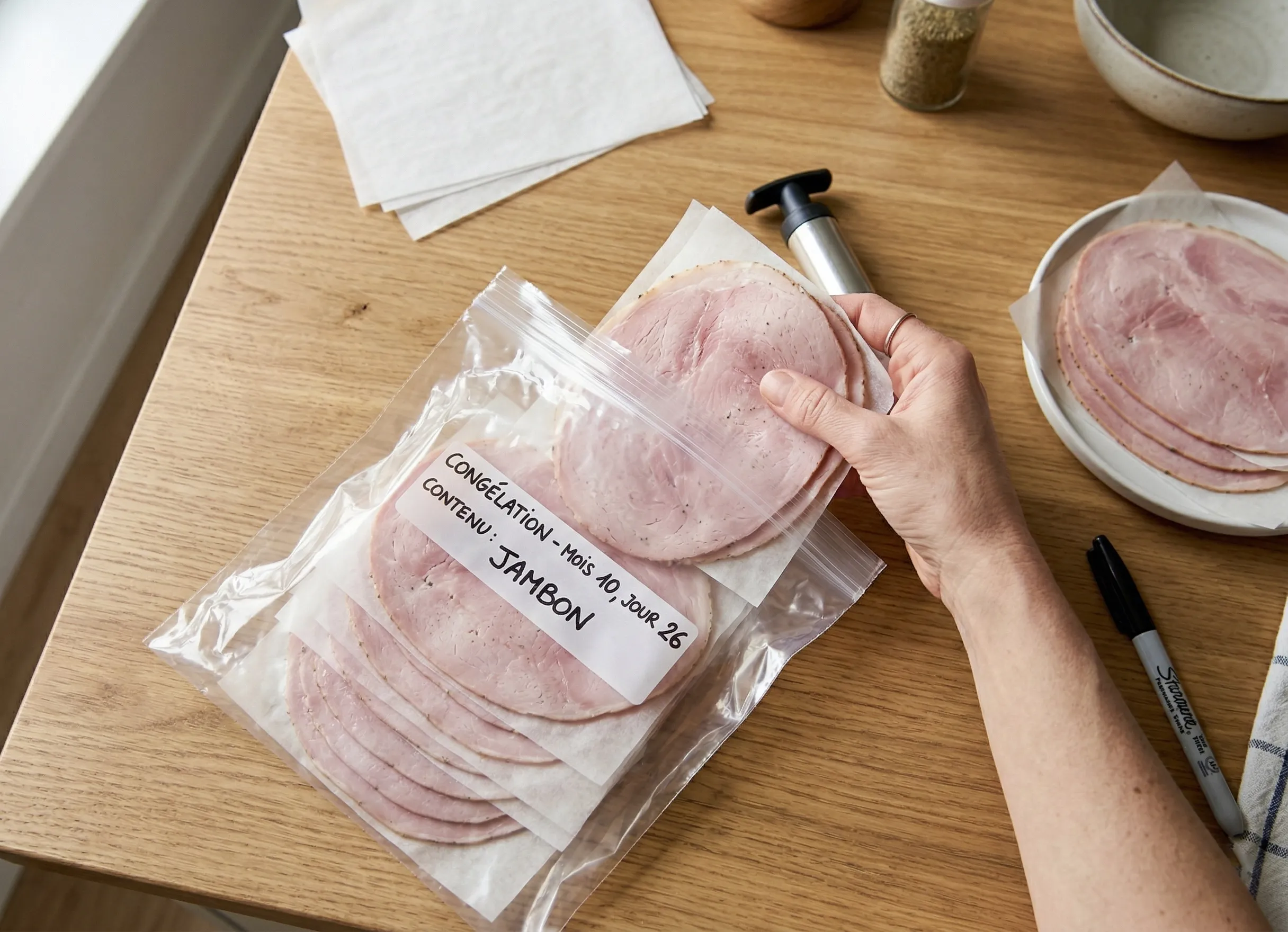 Les sacs de congélation à zip sont préférables aux boîtes rigides. Ils permettent d’expulser l’air manuellement avant de fermer. Moins il y a d’air, moins le jambon s’oxyde. C’est mathématique et efficace.