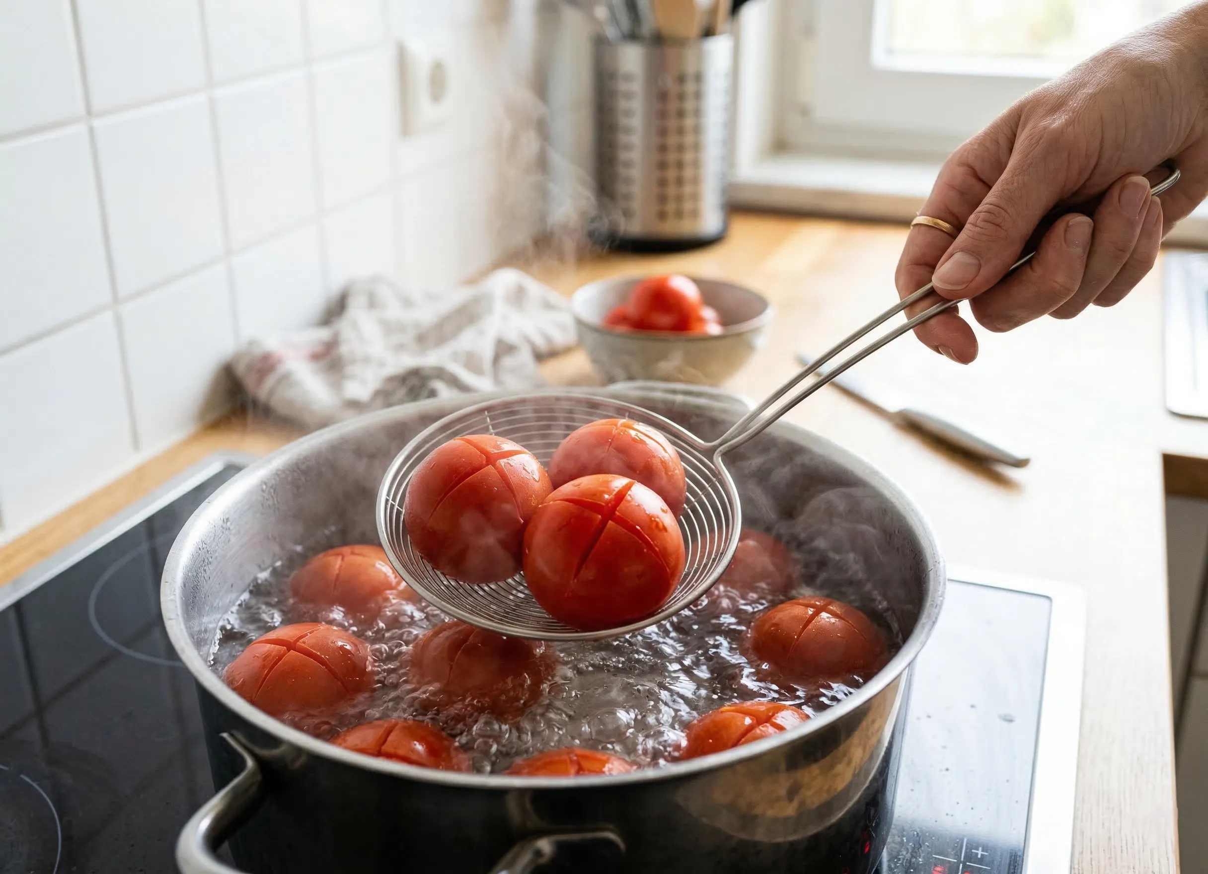 Passez-les immédiatement dans un saladier d’eau glacée. Ce choc thermique stoppe net la cuisson interne. La peau se retirera alors d’un simple geste.