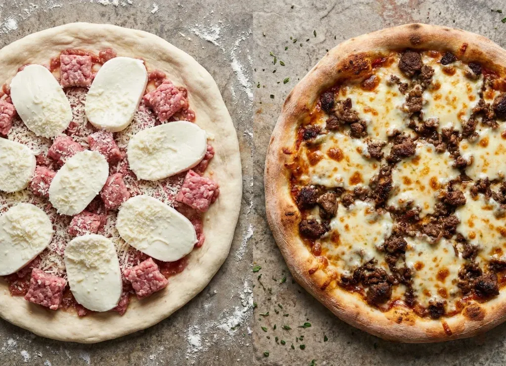 Sur une pizza viande hachée faut il cuire la viande avant ? En la plaçant sur la sauce tomate, sous le fromage, on évite qu’elle ne brûle. Le fromage agit comme un bouclier thermique indispensable.