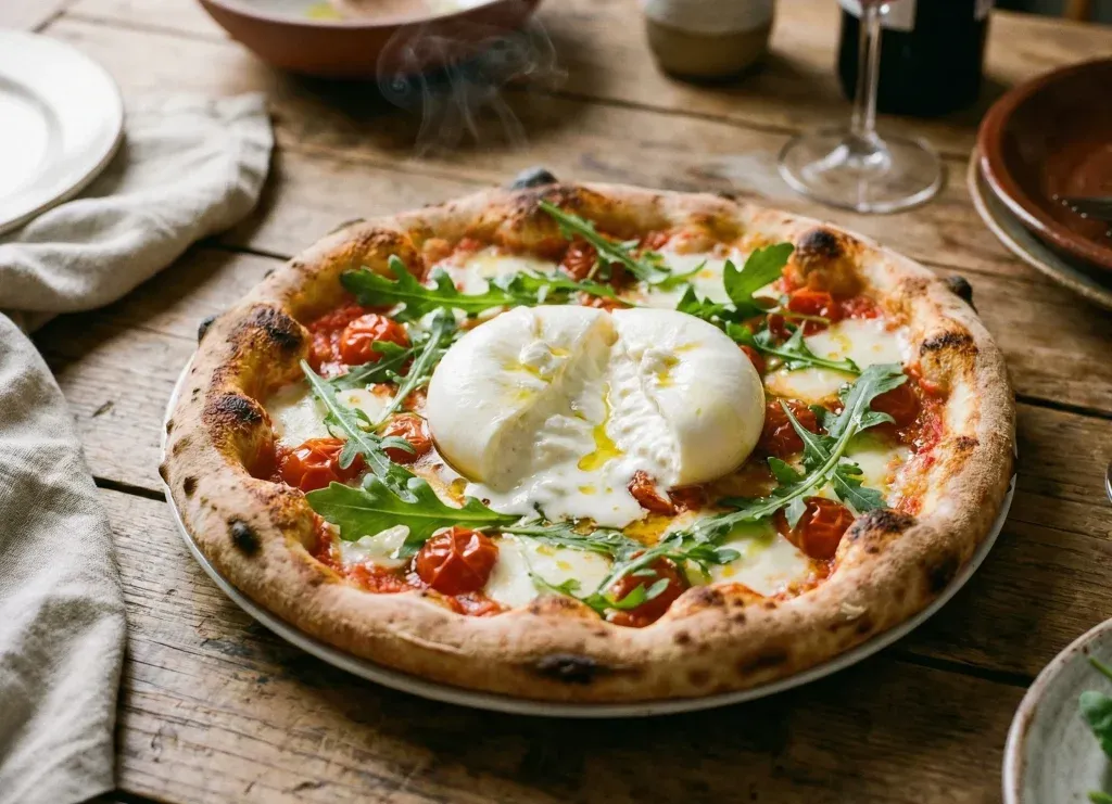 La burrata doit rester froide, c’est impératif pour que son cœur crémeux contraste avec la pâte chaude. La roquette apporte cette amertume poivrée qui réveille l’ensemble. C’est le sommet de la fraîcheur.